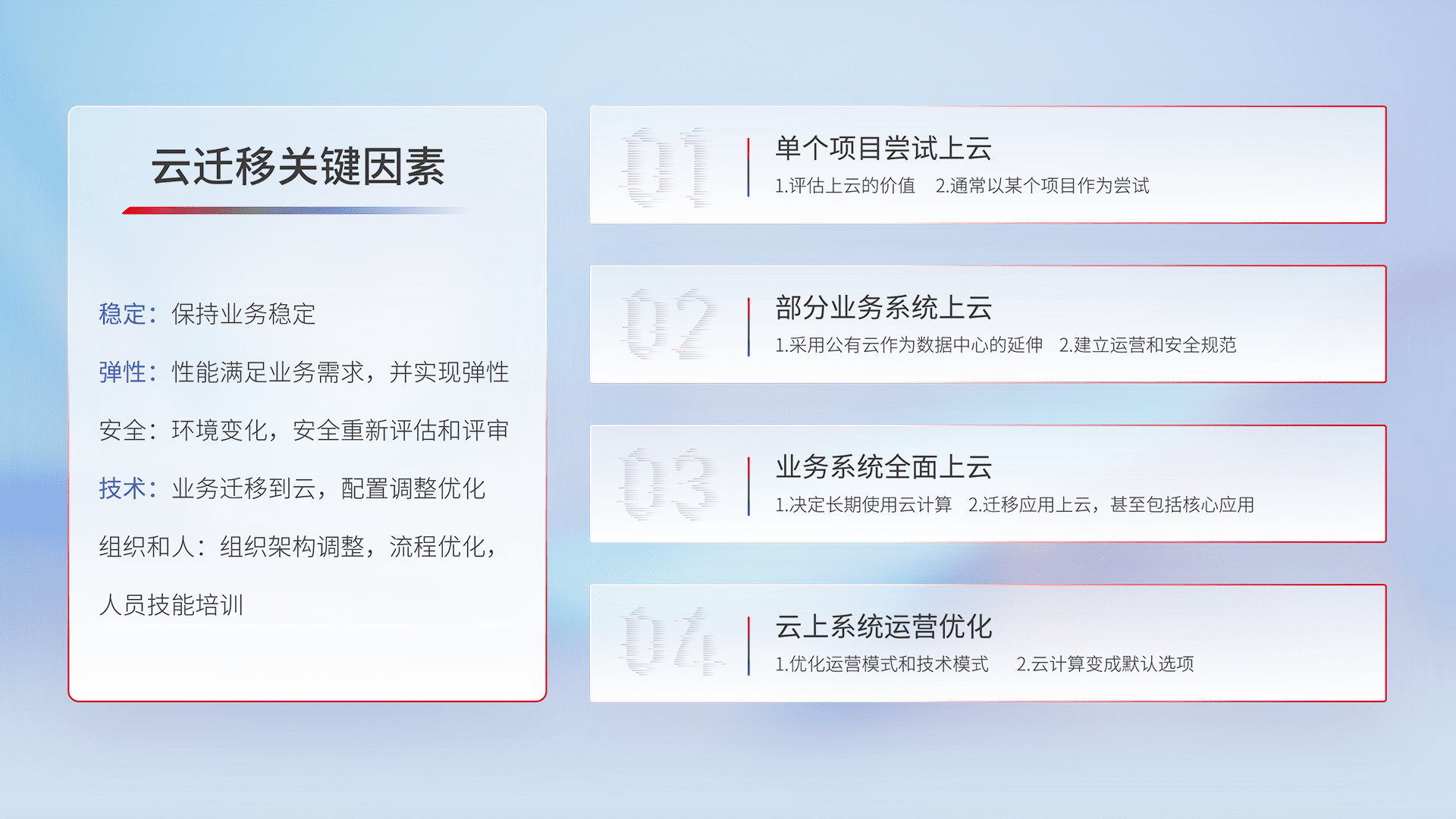 结合实际业务,,,从规划设计、、、、云平台选型、、、、云原生改造、、、数据迁移、、、集成交付,,迁移全过程为客户识别最佳上云路径,,,,做好风险识别管理,,设计网络架构、、、身份权限、、、、安全审计合规、、、操作审计、、、日志审计、、监控告警策略、、多站点容灾设计等,,对云上基础设施进行整体规划,,,,提升IT治理水平,,,以满足弹性、、高可用、、高性能的需求。。